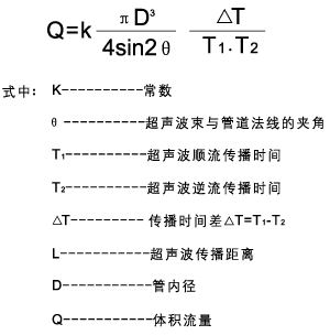 當超聲波在液體中傳播時,探頭1發(fā)射的超聲波脈沖被探頭2所接收,同時,探頭2也發(fā)射超聲脈沖,探頭1接收,則順流方向聲波傳播速度會增大,逆流方向則減小,同一傳播距離就有不同的傳播時間,利用傳播時間之差與被測流速之關系求取流速,進而得出流量,其關系式如下: |
