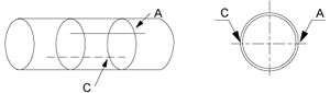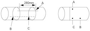 | 從A點開始,沿著定位紙邊邊緣量出管道1/2周長,該點為C,在C點劃一條與定位紙邊緣垂直的直線; |