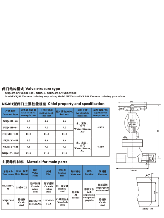 該系列閥門適用于工作溫度≤425℃和≤550℃,工作介質(zhì)為水、空氣、蒸汽的管路上,作為起閉裝置。尤其適用于火電廠汽機(jī)冷凝和真空負(fù)壓系統(tǒng),起到真空密封隔離作用。