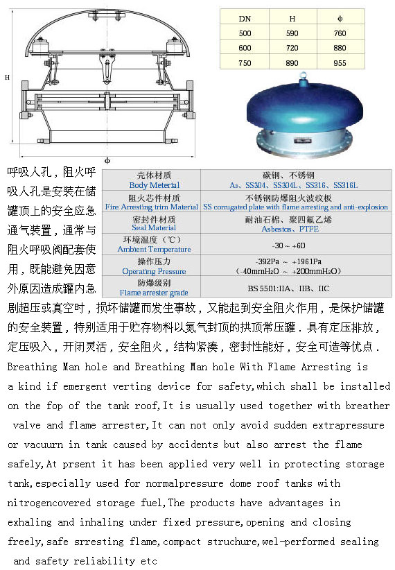 呼吸人孔(KHXF-HR) 呼吸人孔(KHXF-HR),阻火呼吸人孔是安裝在儲罐頂上的安全應(yīng)急勇氣裝置,通常與阻火呼吸閥配套使用,既能避免因意外原因造成罐內(nèi)急劇超壓或真空時,損壞儲罐面發(fā)生事故,又能起到安全阻火作用,是保護儲罐的安全裝置,特別適用于貯存物料以氮氣封頂?shù)墓绊敵汗。具有定壓排放,定壓吸入,開閉靈活,安全阻火,結(jié)構(gòu)緊湊,密封性好,安全可造等優(yōu)點。 |