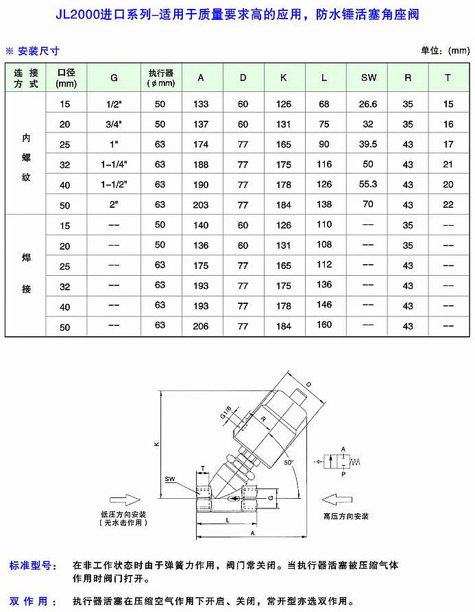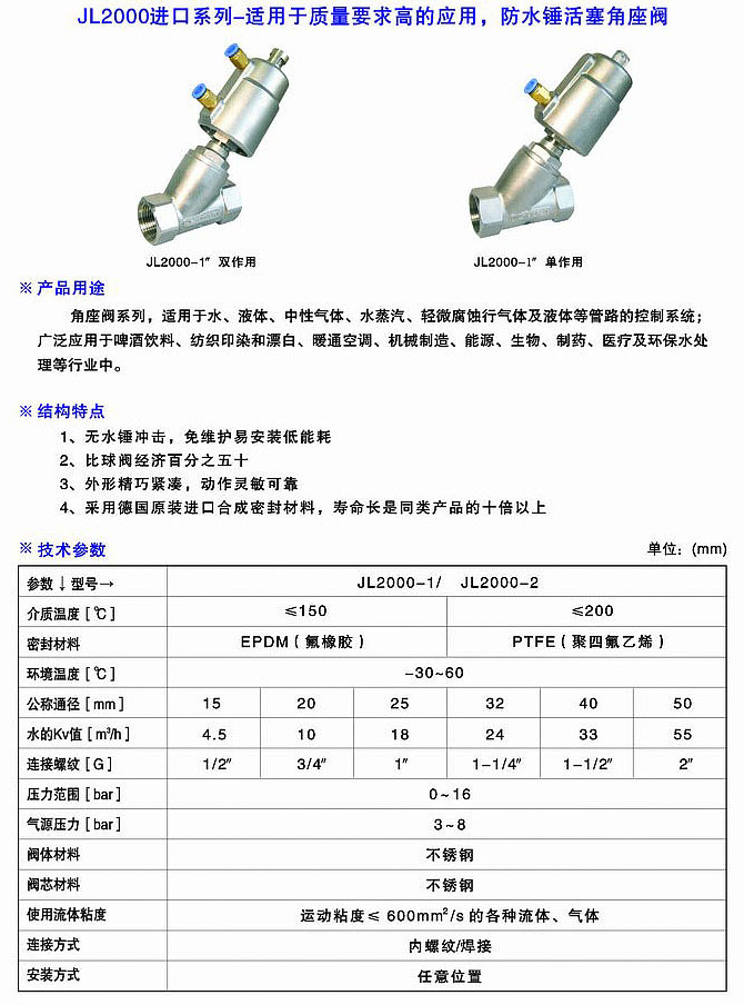 JL2000進(jìn)口系列單作用角座閥是我公司的優(yōu)質(zhì)產(chǎn)品之一,在上海JL2000進(jìn)口系列單作用角座閥廠家中享有極高的品質(zhì)聲譽(yù)與服務(wù)評價(jià).