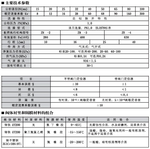 ZMA(B)T一10氣動(dòng)薄膜隔膜調(diào)節(jié)閥為無填料函結(jié)構(gòu)、節(jié)流元件為彈性隔膜,閥體流道平滑;閥體襯里和隔膜均可采用耐腐蝕材料制造,適用于控制各種腐蝕性和懸浮液介質(zhì)的調(diào)節(jié)場(chǎng)合。