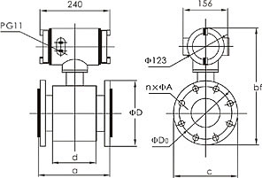 測量流量時,導(dǎo)電性液體以速度V流過垂直于流動方向的磁場,導(dǎo)電性液體的流動感應(yīng)出一個與平均流速成正比的電壓,其感應(yīng)電壓信號通過二個或二個以上與液體直接接觸的電極檢出,并通過電纜送至轉(zhuǎn)換器通過智能化處理,然后LCD顯示或轉(zhuǎn)換成標(biāo)準(zhǔn)信號4~20mA和0~1kHz輸出。 |
