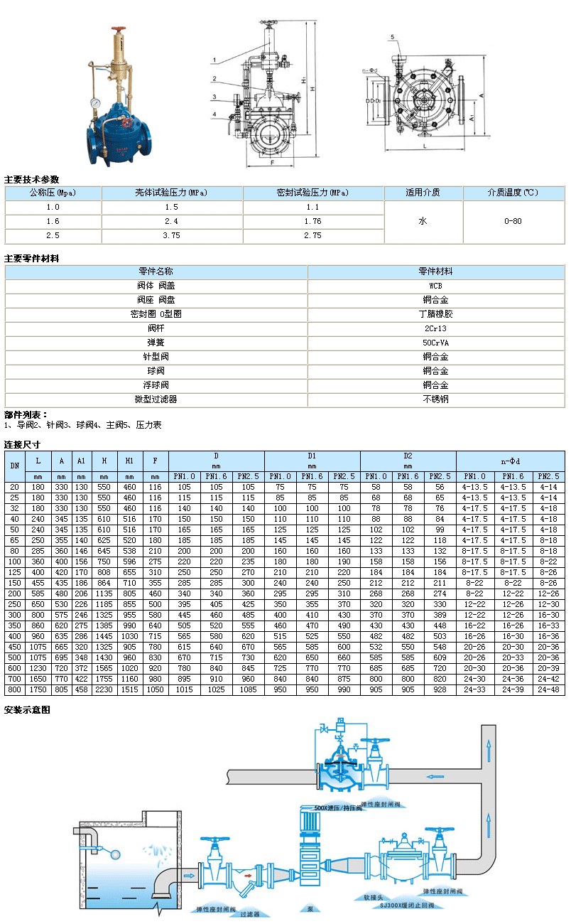 500X泄壓/持壓閥由主閥、泄壓/持壓導(dǎo)閥針閥、球閥、微形過濾器和壓力表組成水力控制接管系統(tǒng)。利用水力自動(dòng)操作,即可以作泄壓閥用又可作持壓閥用。作泄壓閥用時(shí),可維持供水路壓力在設(shè)定的安全值之下;做持壓閥用,可維持主閥上游水壓在設(shè)定值之上,保持主閥上游供水壓力。本產(chǎn)品利用水力自力控制,不需要其它裝置和能源,保養(yǎng)簡便,一閥多用。本系列閥門產(chǎn)品廣泛用于高層建筑、生活區(qū)等供水管網(wǎng)系統(tǒng)及城市供水工程。1、作泄壓閥:當(dāng)泄壓/持壓導(dǎo)閥調(diào)整為泄壓狀態(tài)時(shí),水通過針閥、主閥控制室、球閥A、泄壓/持壓導(dǎo)閥、球閥B流向出口,此時(shí)主閥處于開啟狀態(tài)。當(dāng)進(jìn)口壓力超過泄壓/持壓導(dǎo)閥設(shè)定的安全值時(shí),泄壓導(dǎo)閥會(huì)自動(dòng)開啟,通過球閥C放出部分水,使管路泄壓。當(dāng)壓力恢復(fù)到安全值時(shí),泄壓閥自動(dòng)關(guān)閉。作泄壓閥時(shí),各球閥常開。2、作持壓閥:當(dāng)泄壓/持壓導(dǎo)閥調(diào)整為持壓狀態(tài)時(shí),只要主閥進(jìn)口水壓低于導(dǎo)閥設(shè)定值,導(dǎo)閥即關(guān)閉。主要控制室升壓,主閥關(guān)閉。當(dāng)主閥上游供水壓力超過導(dǎo)閥設(shè)定壓力時(shí),持壓導(dǎo)閥才能打開,控制室的水經(jīng)球閥排至出口,控制室降壓主閥開啟,開始供水,即保持了上游水壓。作持壓閥用時(shí),球閥C常閉或用絲堵?lián)Q下。 |