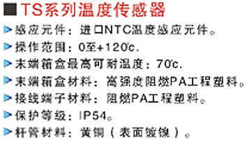 TS系列溫度傳感器采用NTC熱敏電阻為感溫元件,經(jīng)精密的封裝工藝生產(chǎn)而成。具有靈敏度高、穩(wěn)定性強、耐腐蝕、壽命長、安裝方便等優(yōu)點。適用于任何高、低溫及潮濕等惡劣環(huán)境。該溫度傳感器能迅速準確地檢測空氣和水的溫度,并把信號傳遞至控制系統(tǒng),達到準確控制水和空氣溫度的目的。